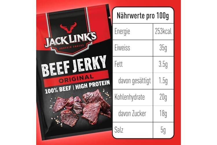 Jack Links Beef Jerky Original – 12 Pack (12 x 25 g) – Gedroogd vlees eiwitsnacks – High protein snack voor gym, fitness, outdoor – American food voor mensen – Gedroogde vlees chips van rundvlees