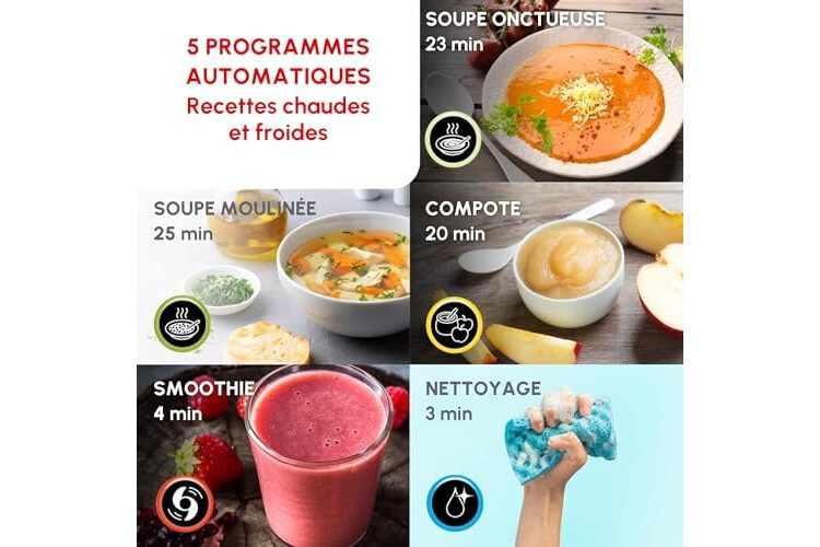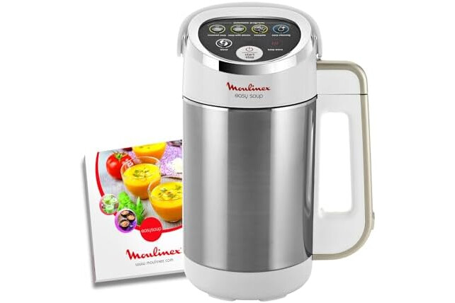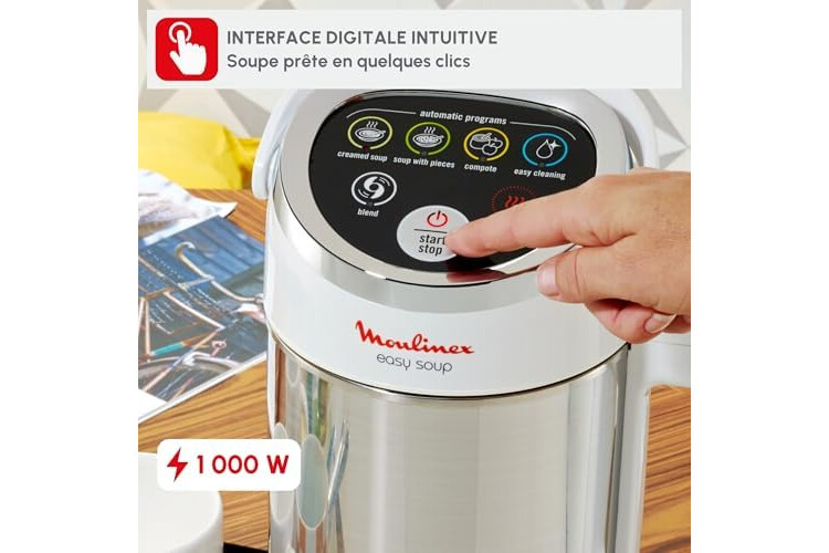 Homemade soup is a classic that is always unanimous. With Easy Soup from Moulinex, preparing it becomes incredibly simple and fast. Designed to make everyday life easier, this 1.2L heated blender automatically mixes and cooks your preparations for perfectly velvety results, with just two press of a button. Thanks to its four versatile automatic programs, you can easily make smooth soups, chunked soups, compotes or cold preparations. It adjusts time and temperature alone to ensure controlled cooking and homogeneous mixing, unattended. Its intuitive interface and simple controls make it accessible to anyone, even beginners. Compact and practical, Easy Soup fits perfectly into your kitchen and allows you to prepare healthy and tasty homemade recipes effortlessly. With Easy Soup, making homemade soup is child's play.