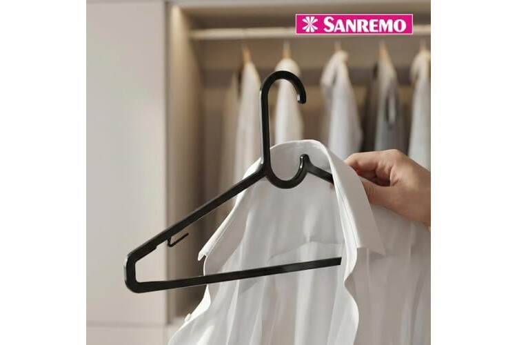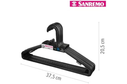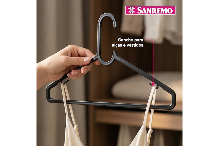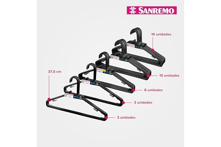 Conjunto com 10 (dez) Cabides Plástico Adulto para Roupas Leves. Possuem alta durabilidade e resistência. Suporta até 2, 5 kg de roupa. Largura 38cm. Ideal para todos os tipos de roupas leves. Recomendado para camisetas, camisas e blusas. Cor Preta. Marca SANREMO.
