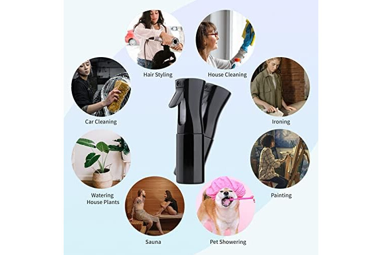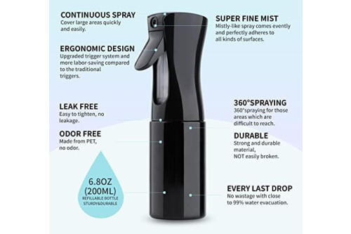 【Ultra fine mist spray pattern distributes water evently】Engineered with a robust pre-compression technology, spray bottle dispenses a stream of sustained mist that lasts for 1.2 seconds. The spray has a fixed output of 1.25cc per second and is dispensed consistently from first to last drop.it provides the right amount of water to mildly saturate the hair without getting gunked like the old kinds, refreshing curls or taming a bed-head in the mornings.