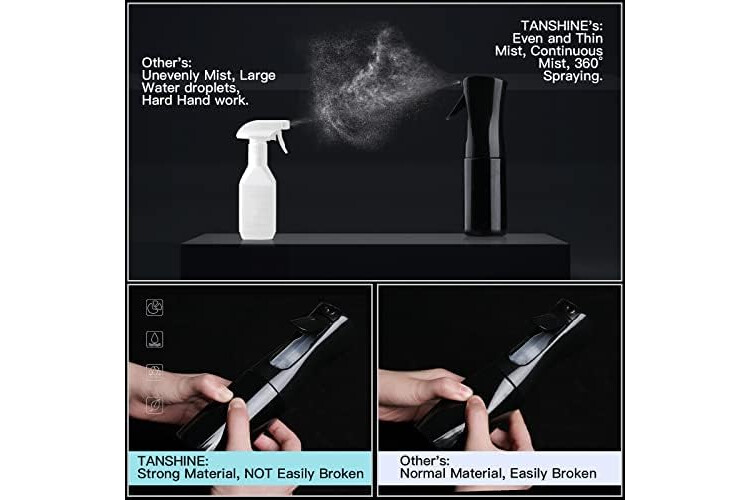 【Ergonomic Design】Fine hair mist spray bottles releases a mist of fine and long lasting with just a gentle squeeze. Ergonomic shape and easy to grip groove handle reduces hand fatigue compared to traditional trigger and finger tip sprayers.