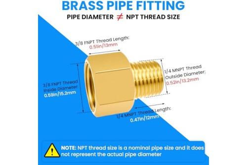 NPT SPEC/SIZE CHECK: NPT1/4-18 Male x NPT3/8-18 Female Brass Pipe Fitting Adapter, can be used in wet environments. The NPT (National (American) Pipe Thread) size is the American standard 60 degree taper pipe thread, is NOT equal to joint diameter size measured by common tools like ruler, tape measure or vernier caliper. Please find the correct size comparison information on the detailed page before purchasing!