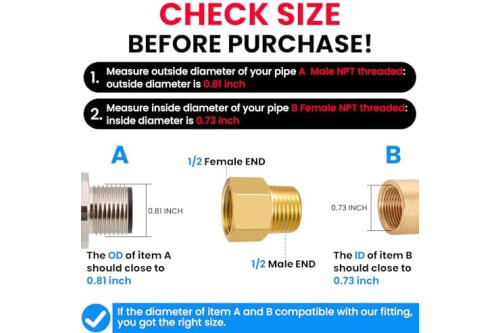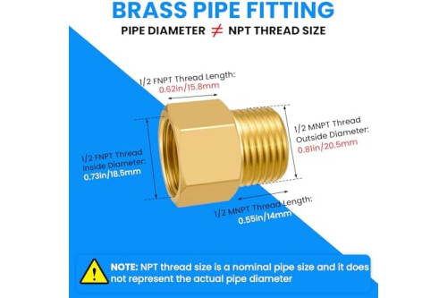 NPT SPEC/SIZE CHECK: NPT1/2-14 Male x NPT1/2-14 Female Brass Pipe Fitting Adapter, can be used in wet environments. The NPT (National (American) Pipe Thread) size is the American standard 60 degree taper pipe thread, is NOT equal to joint diameter size measured by common tools like ruler, tape measure or vernier caliper. Please find the correct size comparison information on the detailed page before purchasing!
