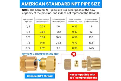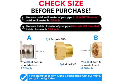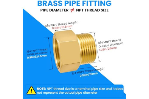NPT SPEC/SIZE CHECK: NPT3/4-14 Male x NPT3/4-14 Female Brass Pipe Fitting Adapter, can be used in wet environments. The NPT (National (American) Pipe Thread) size is the American standard 60 degree taper pipe thread, is NOT equal to joint diameter size measured by common tools like ruler, tape measure or vernier caliper. Please find the correct size comparison information on the detailed page before purchasing!