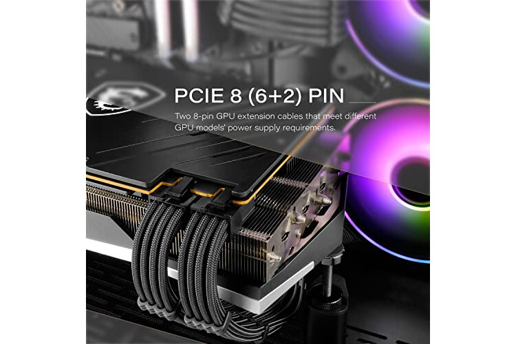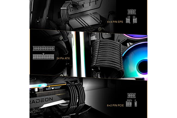 Our cable extensions harmonize perfectly with PC components, offering a customized and tidy appearance. The kit includes cable combs for better organization and airflow. At 30 cm long and made from PET material, the cables are soft, flexible, and durable.