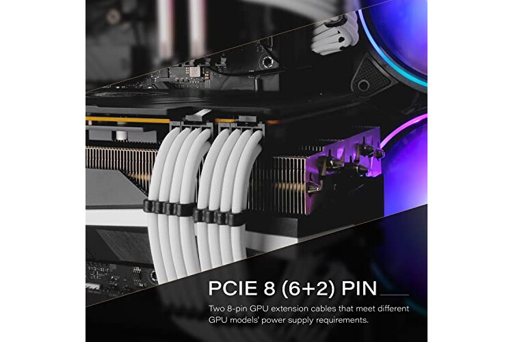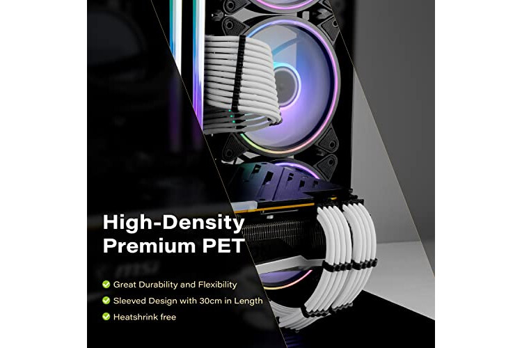 Our cable extensions harmonize perfectly with PC components, offering a customized and tidy appearance. The kit includes cable combs for better organization and airflow. At 30 cm long and made from PET material, the cables are soft, flexible, and durable.