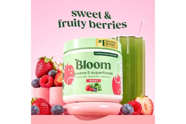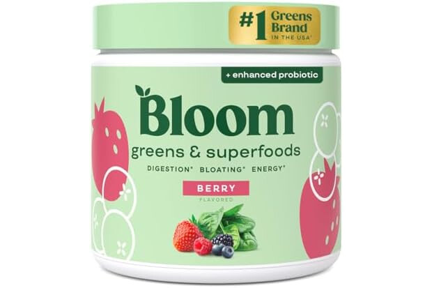 Bloom Nutrition Superfood Greens Powder, Digestive Enzymes with Probiotics and Prebiotics, Gut Health, Bloating Relief for Women, Chlorella, Green Juice Mix with Beet Root Powder, 30 SVG, Berry