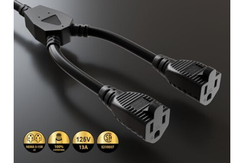 DUAL OUTLET DESIGN: Y power cord transforms one power source into two NEMA 5-15R outlets for multiple device connections