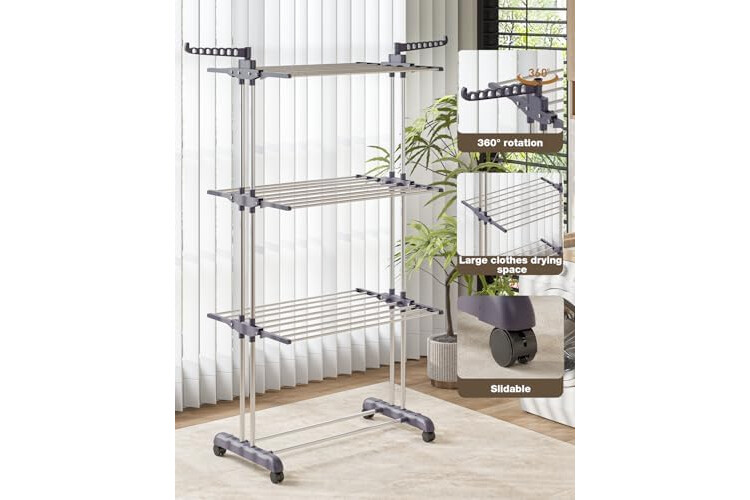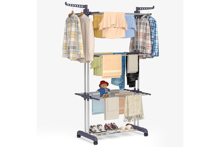 4 TIER CLOTHES DRYING AREA: 6 retractable trays and 2 side wings for airing towels, socks, shirts, sweaters, hats, coat, suits, dresses, shoes etc. Each clothes drying rack can be folded down to conserve space, you can dry clothes on multiple rails, 7 hooks on 2 side wings for additional hanging drying.
