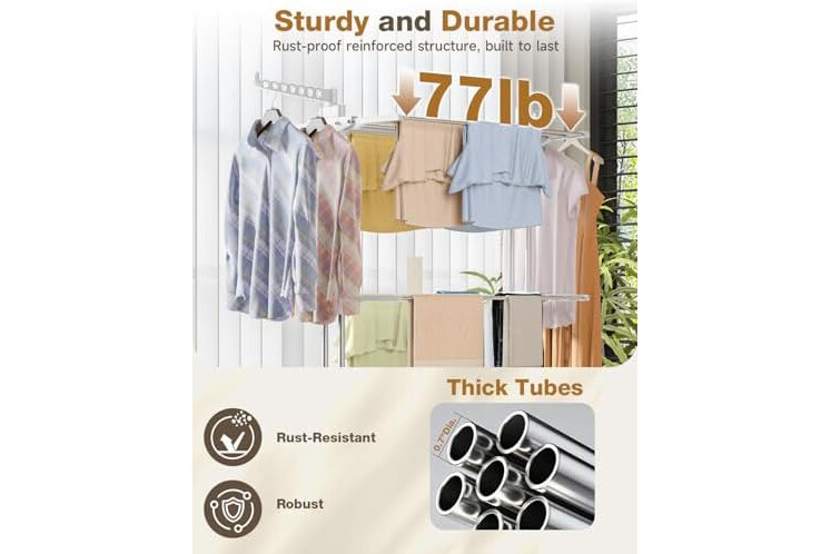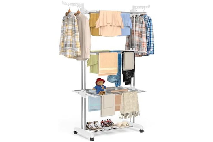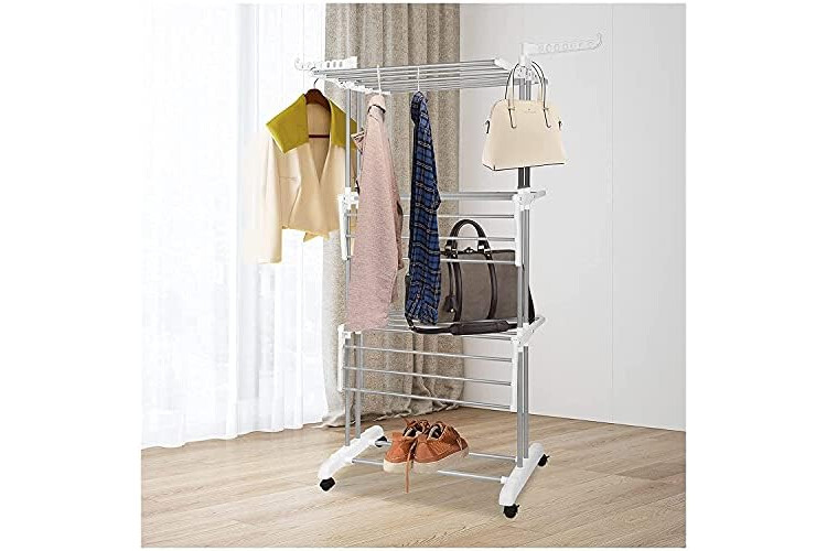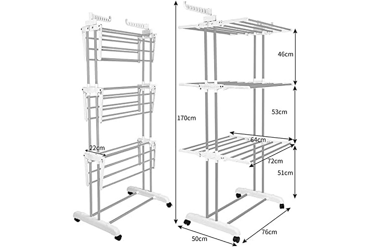 4 TIER CLOTHES DRYING AREA: 6 retractable trays and 2 side wings for airing towels, socks, shirts, sweaters, hats, coat, suits, dresses, shoes etc. Each clothes drying rack can be folded down to conserve space, you can dry clothes on multiple rails, 7 hooks on 2 side wings for additional hanging drying.