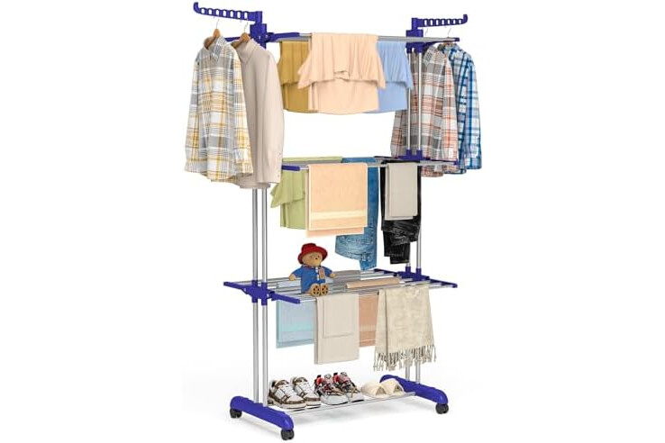 4 TIER CLOTHES DRYING AREA: 6 retractable trays and 2 side wings for airing towels, socks, shirts, sweaters, hats, coat, suits, dresses, shoes etc. Each clothes drying rack can be folded down to conserve space, you can dry clothes on multiple rails, 7 hooks on 2 side wings for additional hanging drying.