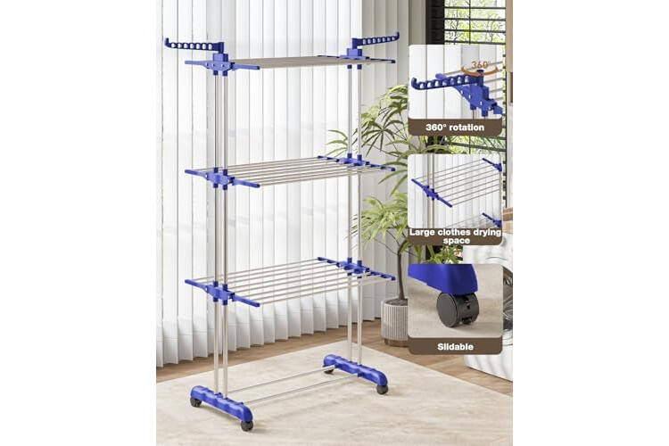 Bigzzia Clothes Drying Rack, Folding Stainless Steel Drying Rack Clothing Indoor Outdoor, Space-Saving, 4 Tier Laundry Drying Rack with Two Side Wings Grey Blue