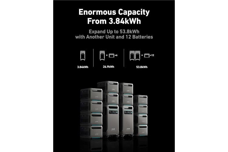 Huge Capacity Up to 26.9kWh: Anker SOLIX F3800 has 3.84kWh to power your family's needs for one day. If that's not enough, add up to six battery packs to expand capacity to 26.9kWh. That's enough power for a week.