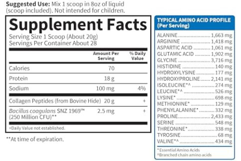 20g EASY TO USE COLLAGEN PEPTIDES: Dissolves quickly in hot or cold liquids, from smoothies and coffee to tea and shakes. Conveniently mix a scoop of unflavored collagen powder in water or almond milk for a nutritional boost any time.