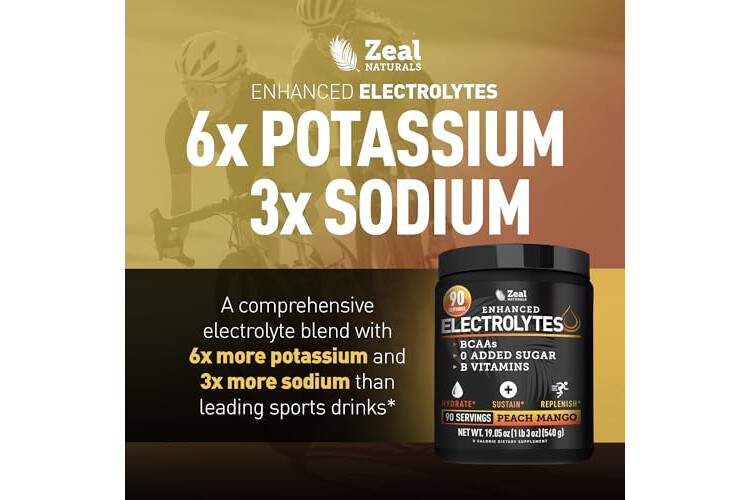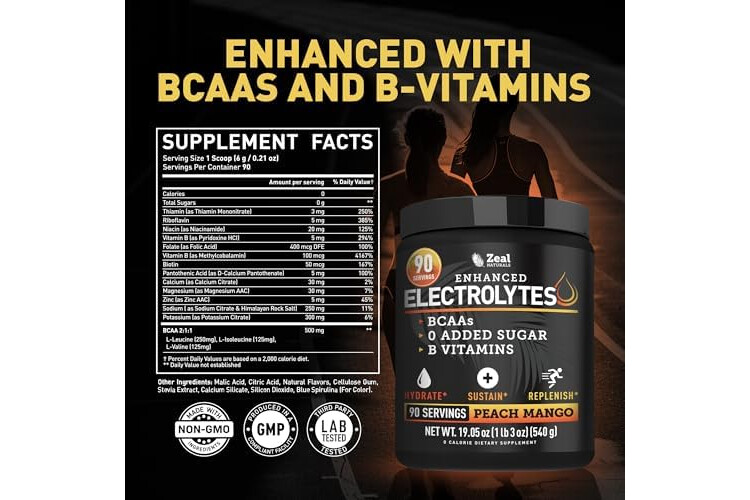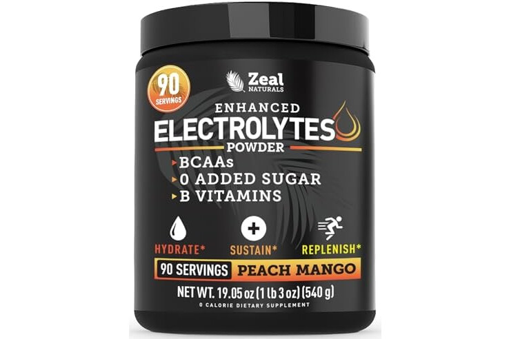 Zeal Electrolyte Powder - 90 Servings | Keto Electrolytes Powder | Zero Sugar, BCAAs, B-Vitamins | Potassium, Zinc, Magnesium | Hydration Powder Recovery Drink | Peach Mango