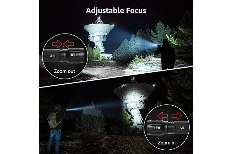 ZOOMABLE FLASHLIGHT- Led flashlight has ability to narrow or widen the area you wish to light. You can stretch the head-pulling zoom to adjust its focus and get spot beam or flood beam you need.
