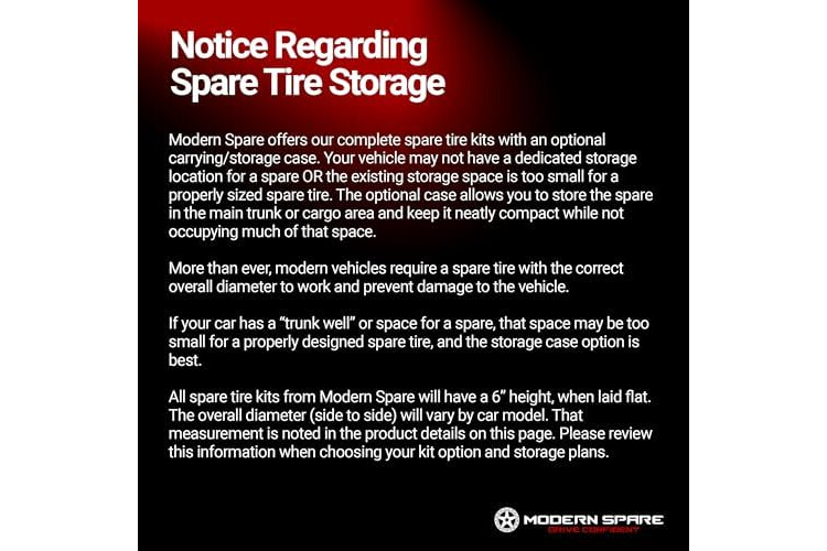 Available Complete Tire Changing Kit – Includes a Modern Spare-Exclusive design 4,000 lb scissor jack with a vehicle-specific jack-head, Easy lift ratcheting jack handle, an ultra-high torque Compact Cross-wrench with dual reversible 17mm, 19mm, 21mm, and 22mm socket set, and a large poly tire bag for transporting dirty, grimy failed full-size tire and protect the car’s interior.