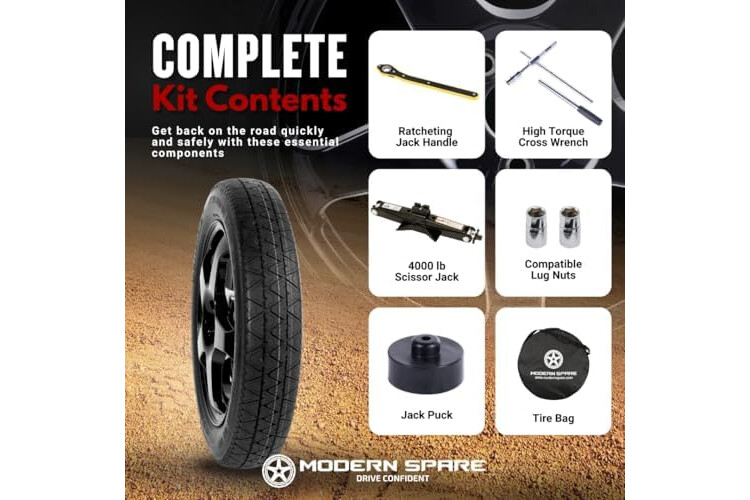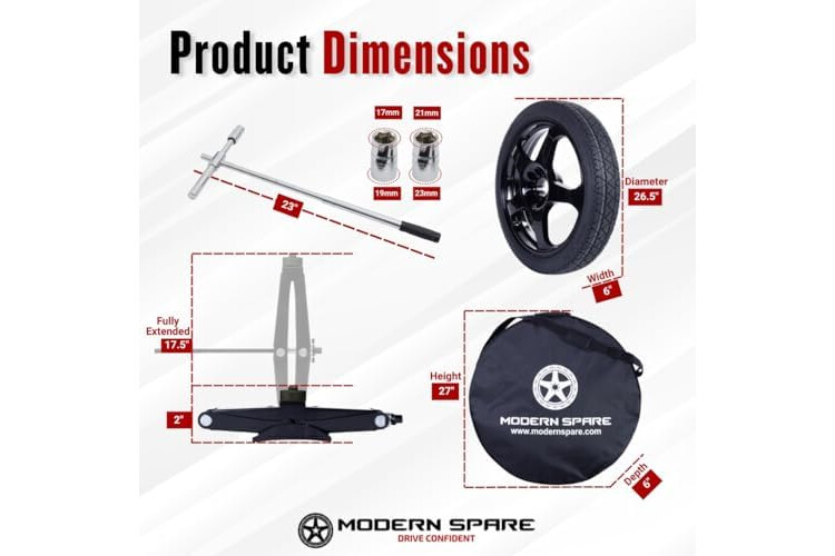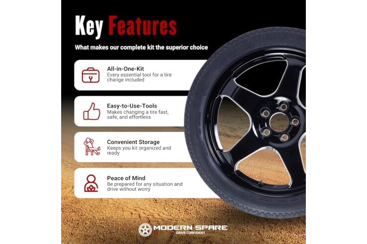 Durable, Lightweight Alloy Spare Wheel & Tire Assembly – Includes a Modern Spare proprietary 18x4 lightweight aluminum alloy wheel with a 5X114.3mm bolt pattern. Paired with a T135/80/R18 radial tire DOT rated at 104M, featuring a 26.5” rolling diameter for extended use and maintained driving range. A premium Tesla spare tire built to complement OEM automotive wheels without compromise.