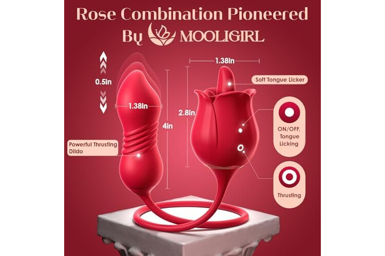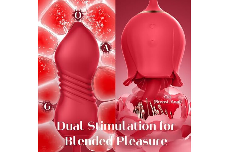 4-in-1 Rose Vibrater with Licking, Thrusting & Vibrating: our rose sex toy vibrator combines 9 licking, 9 thrusting, 9 vibrating functions and App function to stimulate the clit & G-spot/P-spot simultaneously, and hit every nerve ending. The rose female thrusting vibrator is perfect for solo or couples play
