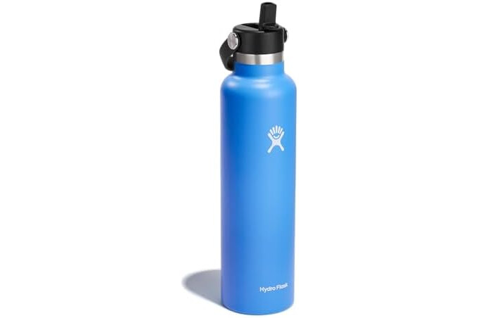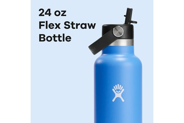 24 OZ CASCADE BLUE STRAW BOTTLE: A 24 oz Standard Mouth water bottle with small drinking spout with Hydro Flask's leakproof Flex Straw Cap—easy to fill, easy to drink. Open it up, add your ice, and flip to sip. The insulated stainless steel keeps it cold for up to 24 hours.