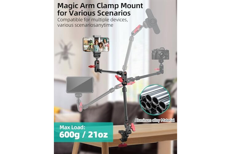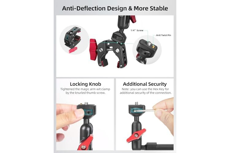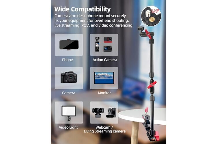 22" Magic Arm & Anti-Deflection Design: (1)22" magic arm is designed with 1/4 screws on both ends. Video light / ring light/ smartphone can be connected for video recording, overhead shooting, live streaming,etc (2) Desk phone mount is designed with anti-deflection deadbolt lock structure at both ends. Camera mount clamp & magic arm can be securely connected by 1/4 screw & deadbolt lock, so you don't have to worry about loosening caused by reverse deflection during use, improving stability and safety
