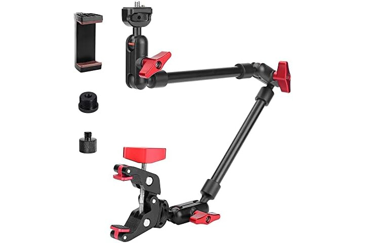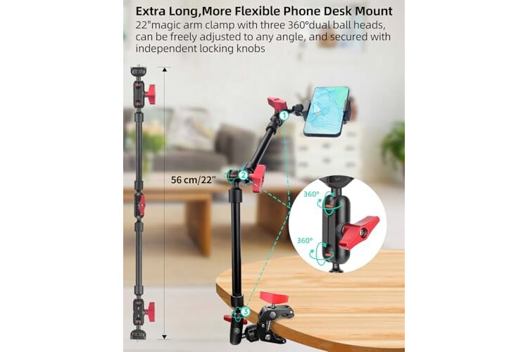 Multiple Shooting Angles & Individually Adjustable:(1)The angle or position of double ball head magic arm phone mount can be freely adjusted to meet your shooting needs (2)Each joint of phone desk mount consists of a 2-point ball head & 1-point T-type knob to increase the flexibility of the installed equipment's fixture position and angle (3) Each joint has a T-type knob to control each joint separately. ❗NOTE: The Red Knobs on the super clamp and magic arm are not detachable. Forcible removal may cause th...