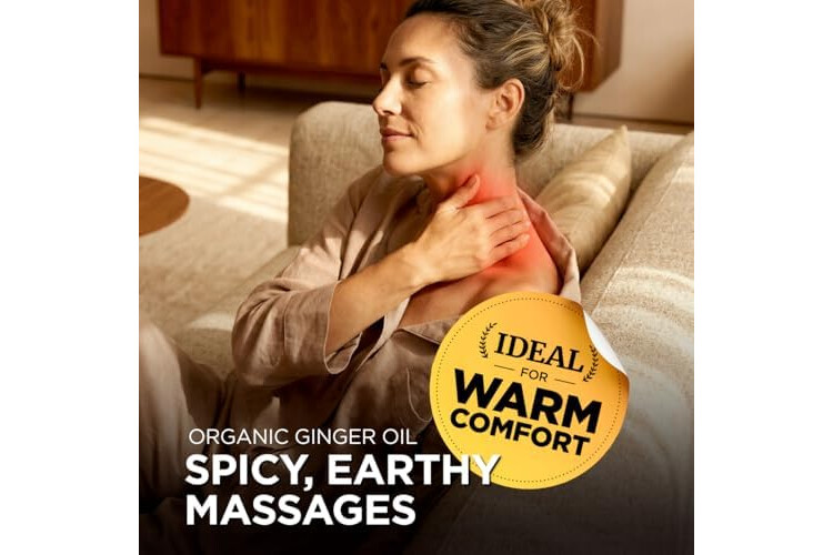 Comforts the body with warmth Ginger essential oil organic has a distinct warm scent and may be a viable option to comfort tired bodies. Massage 3 drops with carrier oil on sore areas until fully absorbed.