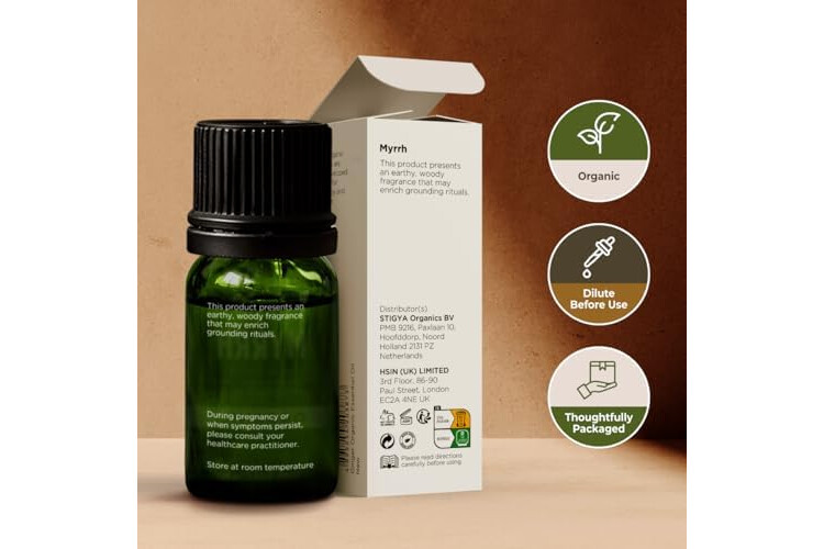 ENJOY WARMING COMFORT. Organic Essential Oils Myrrh offers comfort when applied to tired muscles. Dilute 3 drops of Myrrh Essential Oils with a Carrier Oil and gently massage onto tender areas for a soothing experience.