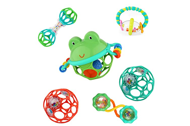 All Oball rattle toys are made for ages newborn and up; the on-the-go rattles are ideal for ages 3 months and up; great gift set for baby shower gifting