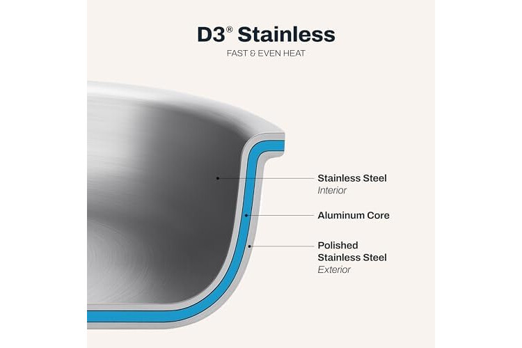 D3 Stainless is the original fully bonded tri-ply cookware trusted by chefs. The aluminum core delivers fast, even heat, while the high-quality stainless steel surface sears beautifully for professional results and long-lasting durability