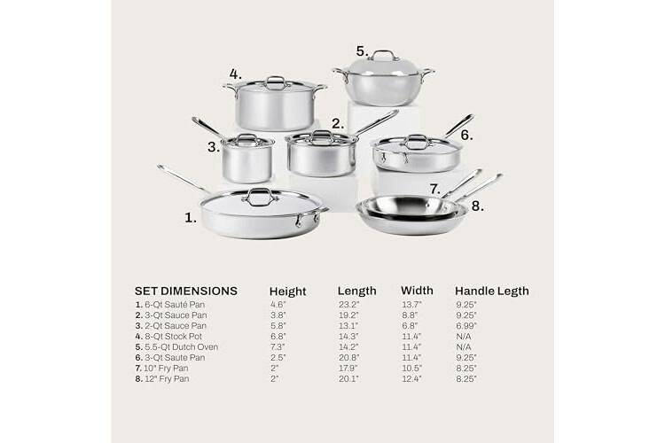 | Included Components | 10" & 12" Fry Pans, 2 qt & 3 qt Sauce Pans with lids, 3 qt &6 qt Sauté Pans with lids, 12" Chef's Pan with lid, 8 qt Stockpot wi |