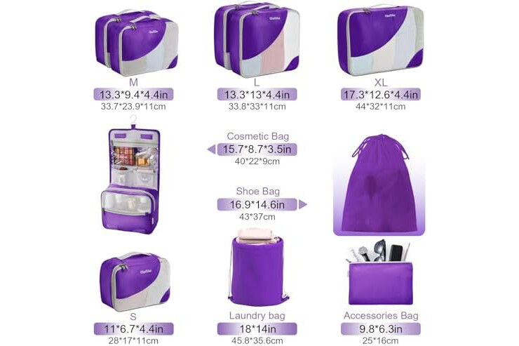 Perfect Fit for All Travel Needs: 6 different sized packing cubes, 1x toiletry bag, 1x laundry bag, 1x shoe bag, 1x accessory bag, for essentials like jackets, shirts, shoes, pants, underwear, toiletries, and more. Laundry bag keeps soiled clothing separate.