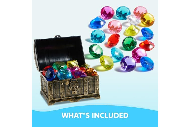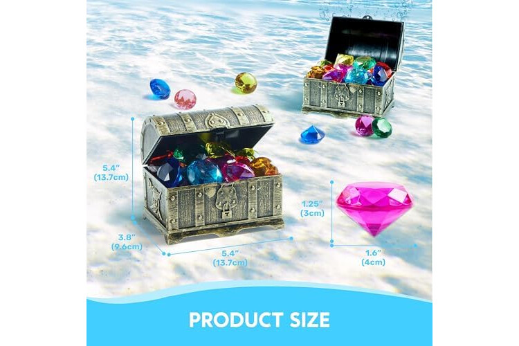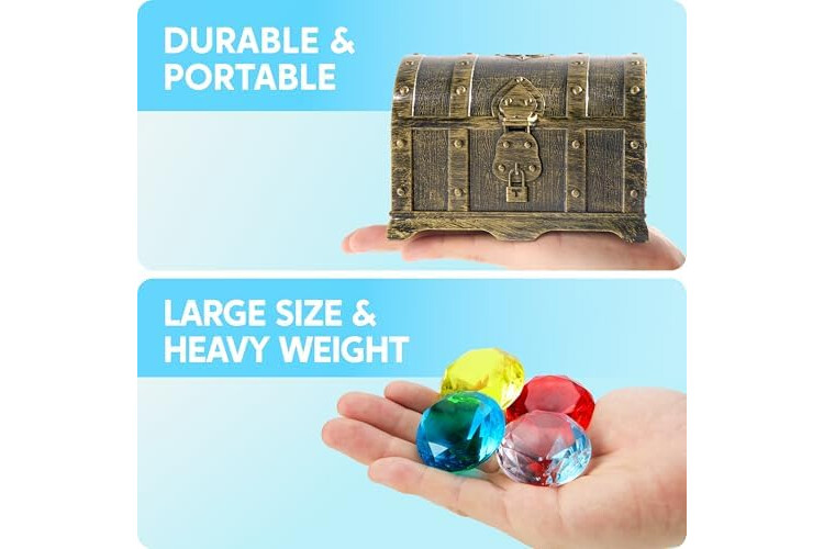 DURABLE & EASY CARRY. The pirate treasure chest is made of durable plastic which will be moldy free and crack free from dropping. Easy storage and carry all your diamonds in one box. The colors are bright and shiny, kids won’t have a hard time finding it in the pool!