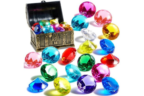 INCLUDES. Package includes 16 diamond acrylic gems in 12 assorted colors that measures 1.6 x 1.6 x 1.25 inches. It comes with a 3.8" x 3.8" x 5.4" plastic vintage pirate treasure box for easy storage.
