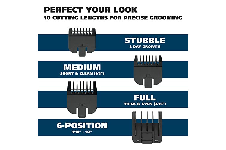 10 Cutting Lengths - Achieve a range of beard styles with 10 different beard trimming lengths from 1/8” to ½”; include stubble (1/16) , medium (1/8”) , and full guard (3/16”) in addition to a 6 position guide (1/16” to ½”)