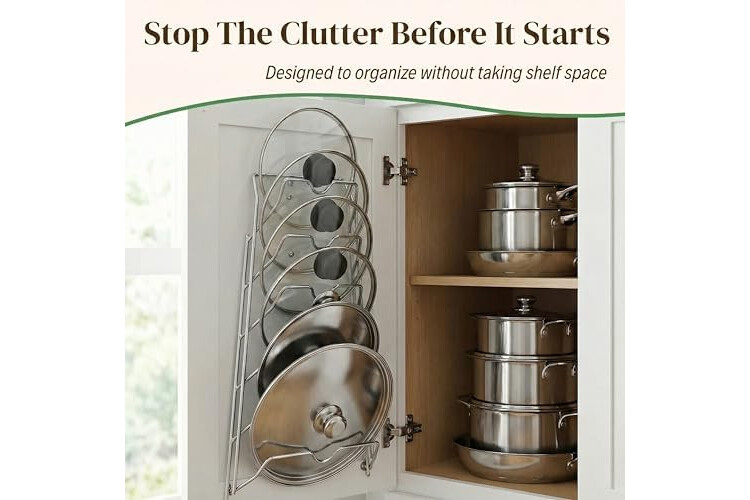 Maximize Cabinet Space: Keep pot and pan lids neatly organized with this 6‑tier rack. Mount it on a cabinet door, pantry wall, or cupboard to save space and make food prep easier.