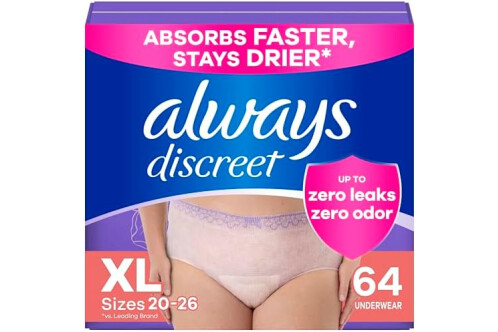 Always Discreet Adult Incontinence Underwear for Women and Postpartum Underwear, Extra Large, Up to 100% Bladder Leak Protection, 64 Count (2 Packs of 32)