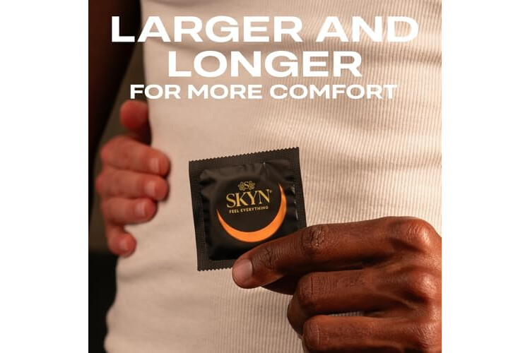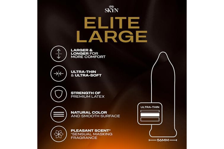 The largest SKYN condom: Designed for an exceptionally sensitive and sensual feeling, these large, thin condoms are 15% thinner than our standard non-latex condom; Elite Large is longer and wider for extra comfort