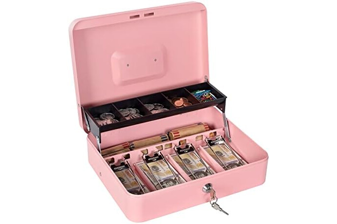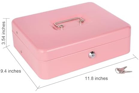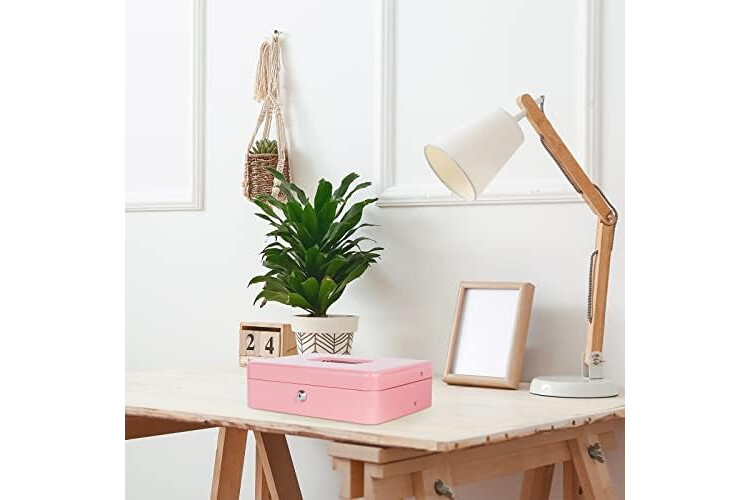 Cash Box with Money Tray and Lock - Metal Money Box for Cash Register, Large Lock Box for Money Safe 11.8" x 9.4" x 3.54" Pink