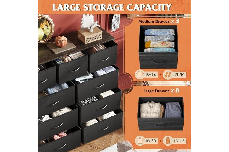 Roomy Storage Space: The 9 foldable deep drawers are so spacious that they provide endless organizational possibilities. Wooden top is great for lamps, clocks, glasses and other daily essentials, keeping them in your reach.