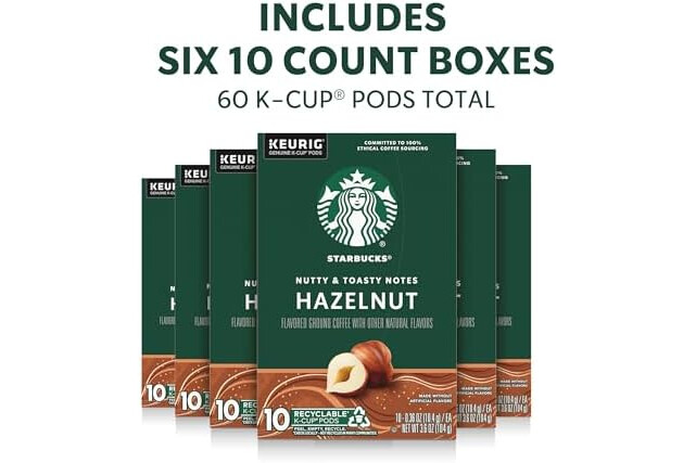 PREMIUM COFFEE IN A K-CUP POD: Enjoy the Starbucks coffee you love at home with six boxes of 10 Starbucks Hazlenut Flavored K-Cup pods, designed for Keurig coffee makers—60 pods total