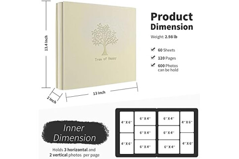 600 PHOTOS LARGE-CAPACITY ALBUM: High fashion Leather hardcover 13.4 x 13 x 2 inches, weight 2.98 lb. Holds 600 4 x 6 photos pictures, totally 60 sheets / 120 pages, each pages holds 3 horizontal and 2 vertical photos.