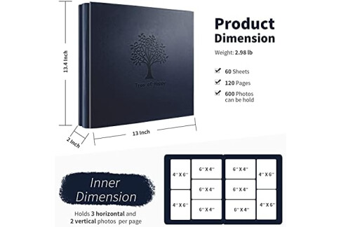 💎600 PHOTOS LARGE-CAPACITY ALBUM: High fashion Leather hardcover 13.4 x 13 x 2 inches, weight 2.98 lb. Holds 600 4 x 6 photos pictures, totally 60 sheets / 120 pages, each pages holds 3 horizontal and 2 vertical photos.