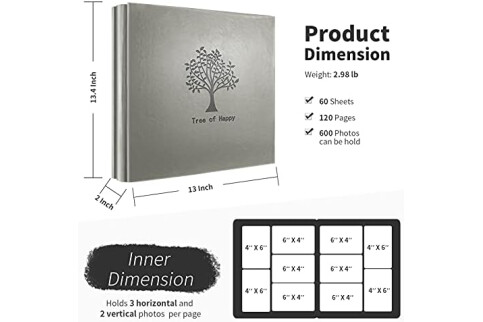 600 PHOTOS LARGE-CAPACITY ALBUM: High fashion Leather hardcover 13.4 x 13 x 2 inches, weight 2.98 lb. Holds 600 4 x 6 photos pictures, totally 60 sheets / 120 pages, each pages holds 3 horizontal and 2 vertical photos.