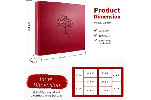 600 PHOTOS LARGE-CAPACITY ALBUM: High fashion Leather hardcover 13.4 x 13 x 2 inches, weight 2.98 lb. Holds 600 4 x 6 photos pictures, totally 60 sheets / 120 pages, each pages holds 3 horizontal and 2 vertical photos.