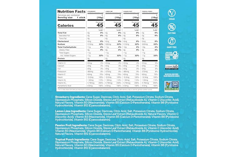 GREAT TASTE: Four delicious flavors in one pack. Lemon Lime is zesty and bright, with a punch of citrus flavor. Passion Fruit has notes of honey, melon and berry flavor. Strawberry has the classic strawberry flavor topped with notes of whipped cream. Tropical Punch has tangy notes of tangerine, pineapple and cherry flavors.