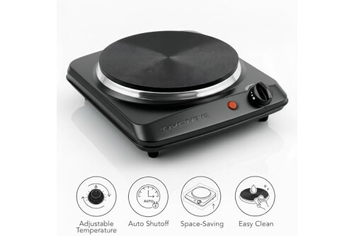 OVENTE Electric Countertop Single Burner, 1000W Cooktop with 7.25 Inch Cast Iron Hot Plate, 5 Level Temperature Control, Compact Cooking Stove and Easy to Clean Stainless Steel Base, Black BGS101B