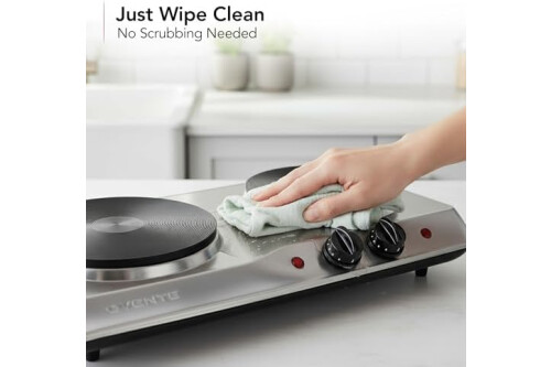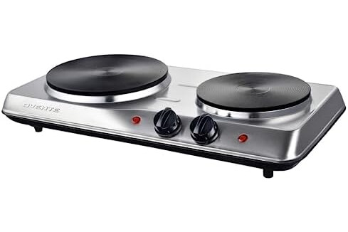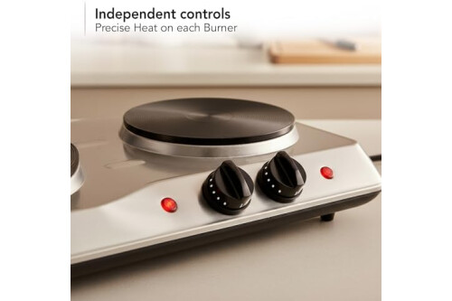OVENTE Electric Countertop Double Burner, 1700W Cooktop with 7.25" and 6.10" Cast Iron Hot Plates, Temperature Control, Portable Cooking Stove and Easy to Clean Stainless Steel Base, Silver BGS102S