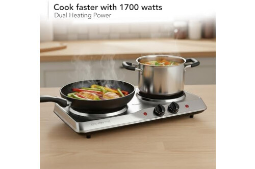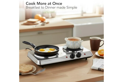 EFFICIENT POWER – This double burner is equipped with a 7.25” and 6.10”cast-iron plate and powered by 1700 watts (120V). It heats up quickly and cooks food evenly. Suitable for frying, keeping food warm, fda boiling hot water or soup.
