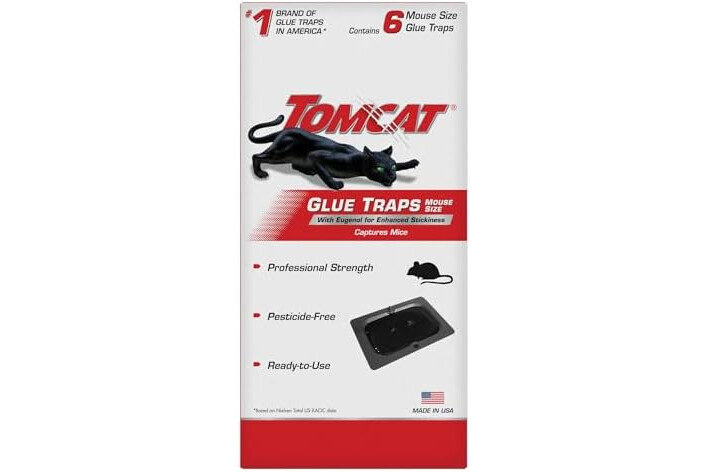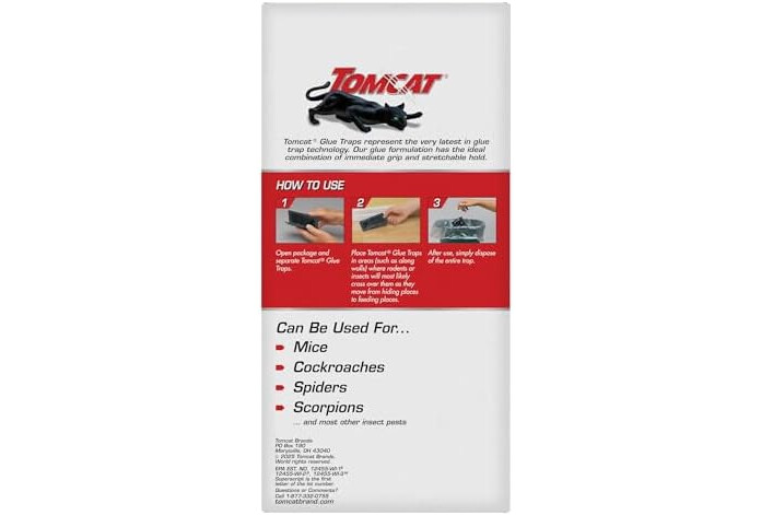 Tomcat Glue Traps Mouse Size with Eugenol for Enhanced Stickiness effectively capture mice and other household pests like cockroaches, spiders, or scorpions without the use of bait
